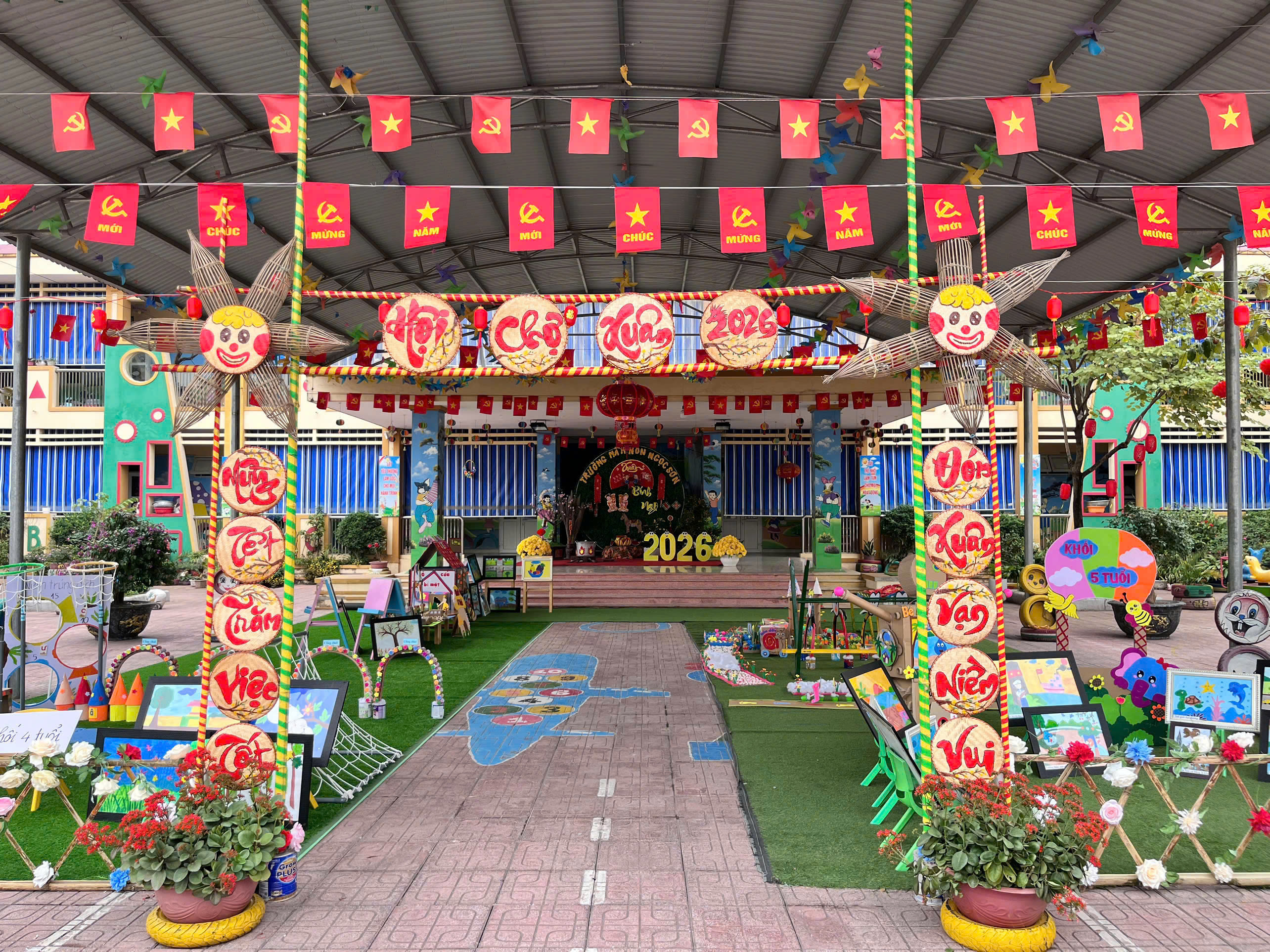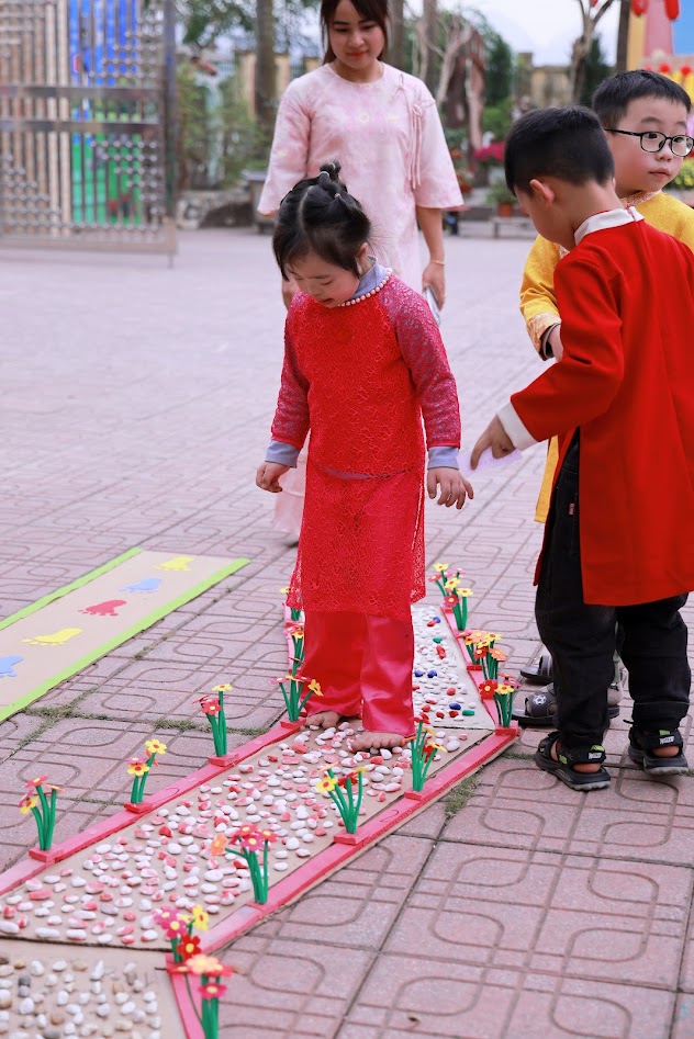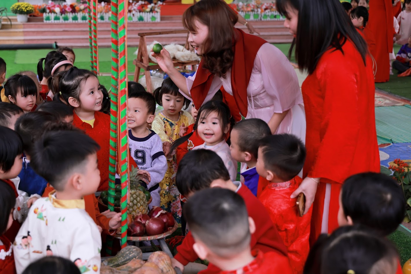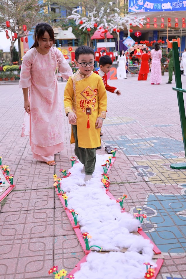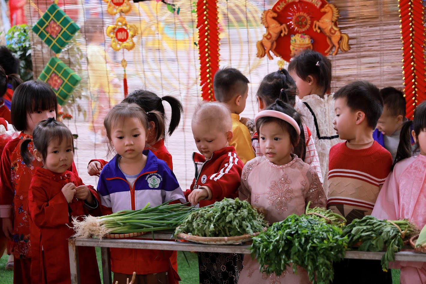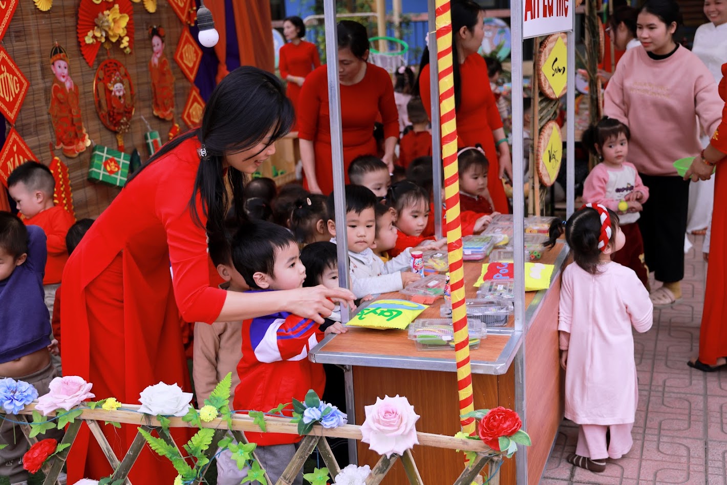 Mỗi độ Tết đến xuân về, trong lòng mỗi người lại rộn ràng những ký ức thân thương. Hôm nay, trong không khí ấm áp ấy, cô và các bé trường mầm non Ngọc Sơn cùng nhau tham gia chương trình Gói bánh chưng và Hội chợ Xuân, để các con được trải nghiệm hương vị Tết cổ truyền và cảm nhận niềm vui sum vầy. Lần đầu tiên được chạm tay vào lá dong xanh mướt, gạo nếp trắng ngần, đậu xanh thơm bùi…, các bé háo hức lắng nghe cô kể chuyện về chiếc bánh chưng – biểu tượng của lòng biết ơn và sum vầy. Những đôi bàn tay nhỏ xinh còn vụng về, nhưng ánh mắt thì lấp lánh niềm vui và sự tò mò. Chính từ những khoảnh khắc giản dị ấy, tình yêu văn hóa dân tộc đang được gieo mầm một cách tự nhiên và ấm áp. Không gian Hội chợ xuân rộn ràng tiếng cười với các gian hàng, trò chơi dân gian và sắc xuân ngập tràn đã mang đến cho các con một ngày trải nghiệm trọn vẹn. Các bé không chỉ được vui chơi, mà còn học cách chia sẻ, giao tiếp, hợp tác và cảm nhận ý nghĩa của Tết cổ truyền theo cách rất riêng của tuổi thơ.