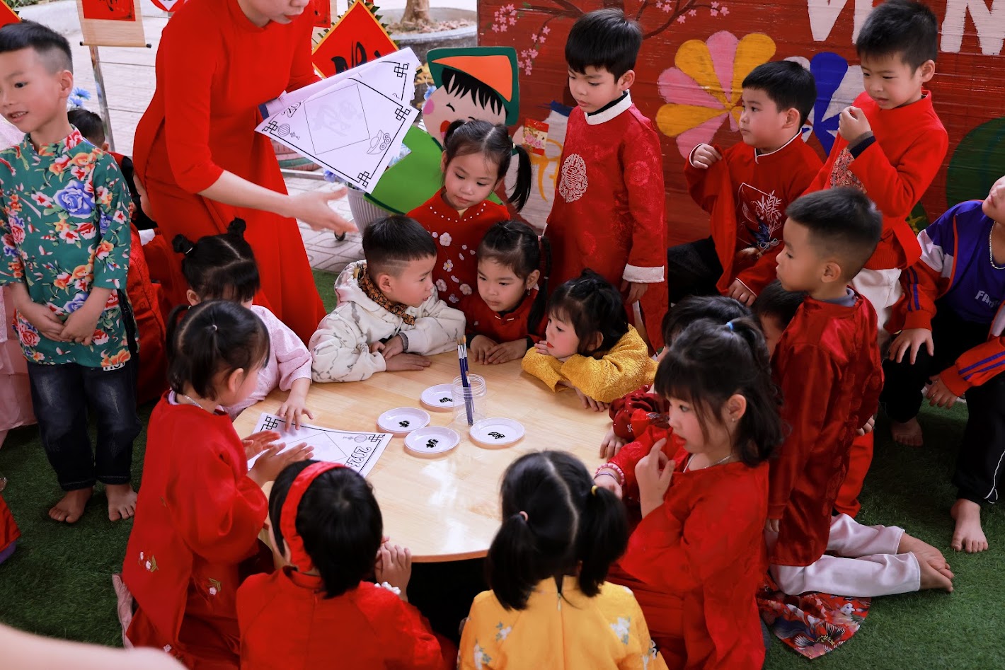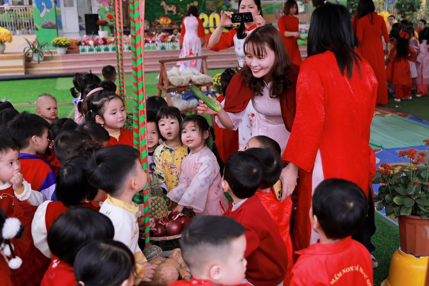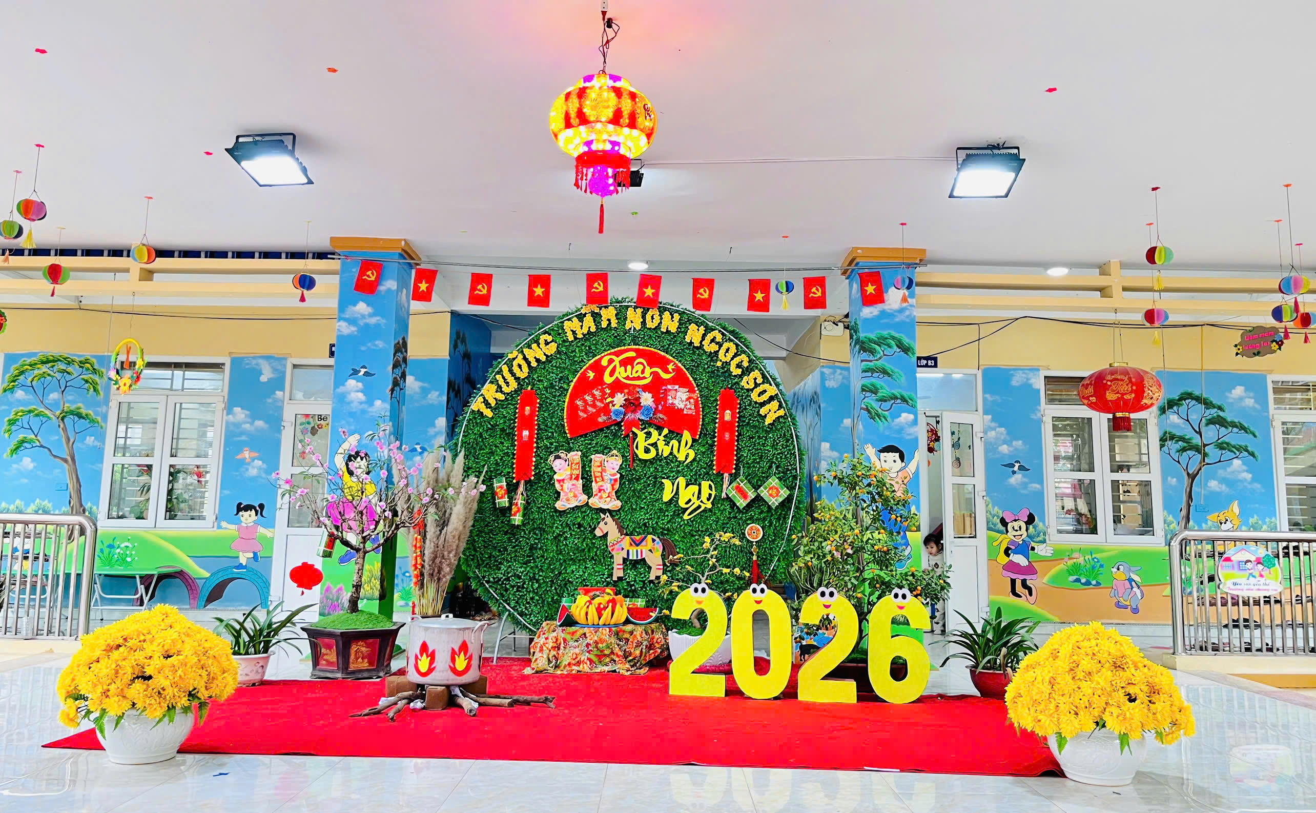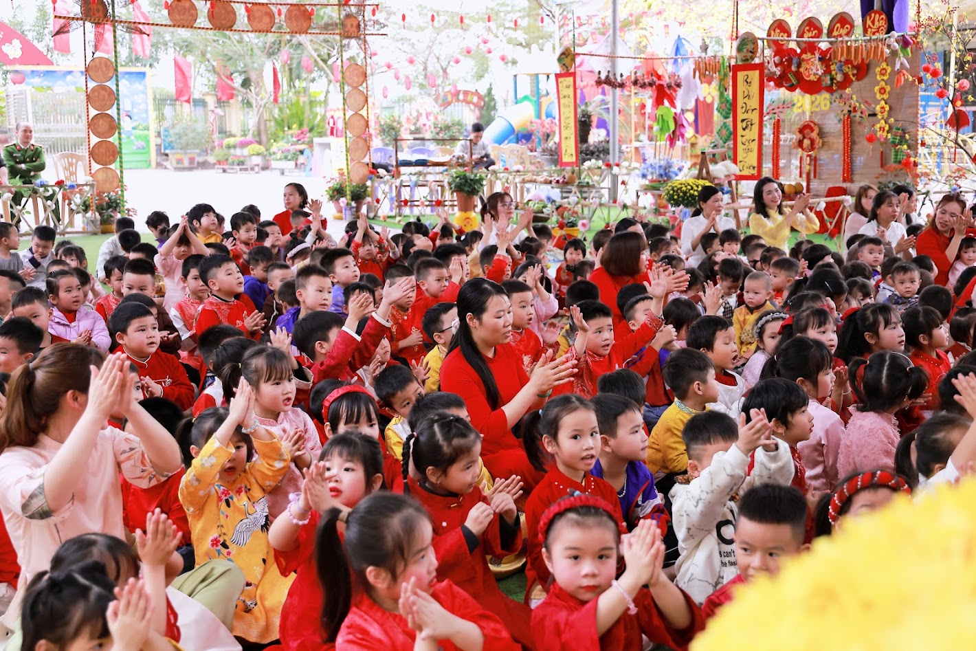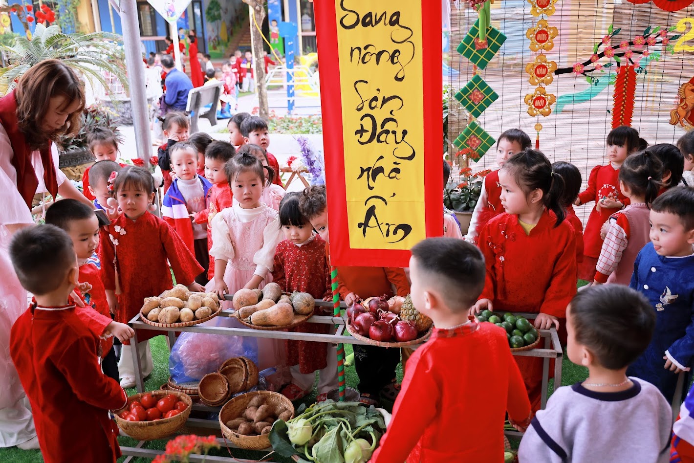 Mỗi độ Tết đến xuân về, trong lòng mỗi người lại rộn ràng những ký ức thân thương. Hôm nay, trong không khí ấm áp ấy, cô và các bé trường mầm non Ngọc Sơn cùng nhau tham gia chương trình Gói bánh chưng và Hội chợ Xuân, để các con được trải nghiệm hương vị Tết cổ truyền và cảm nhận niềm vui sum vầy. Lần đầu tiên được chạm tay vào lá dong xanh mướt, gạo nếp trắng ngần, đậu xanh thơm bùi…, các bé háo hức lắng nghe cô kể chuyện về chiếc bánh chưng – biểu tượng của lòng biết ơn và sum vầy. Những đôi bàn tay nhỏ xinh còn vụng về, nhưng ánh mắt thì lấp lánh niềm vui và sự tò mò. Chính từ những khoảnh khắc giản dị ấy, tình yêu văn hóa dân tộc đang được gieo mầm một cách tự nhiên và ấm áp. Không gian Hội chợ xuân rộn ràng tiếng cười với các gian hàng, trò chơi dân gian và sắc xuân ngập tràn đã mang đến cho các con một ngày trải nghiệm trọn vẹn. Các bé không chỉ được vui chơi, mà còn học cách chia sẻ, giao tiếp, hợp tác và cảm nhận ý nghĩa của Tết cổ truyền theo cách rất riêng của tuổi thơ.