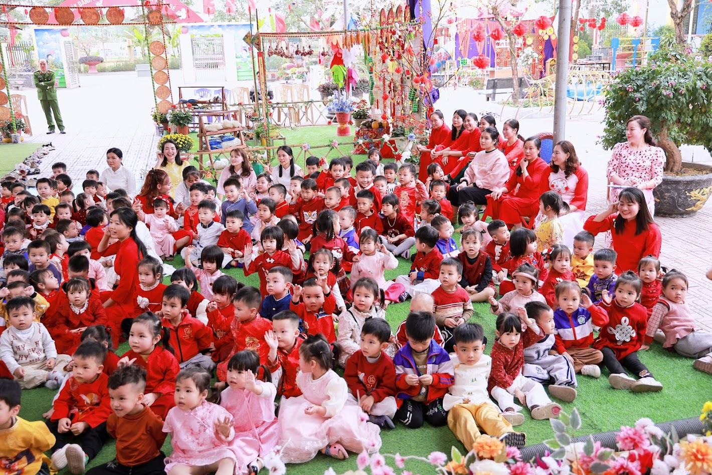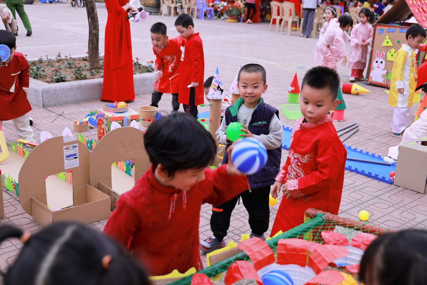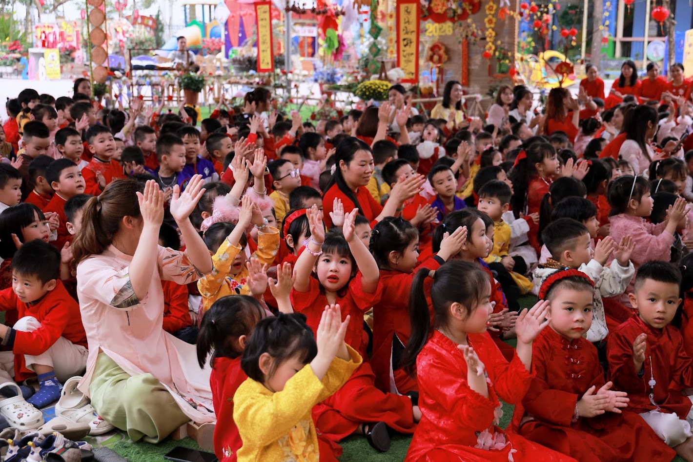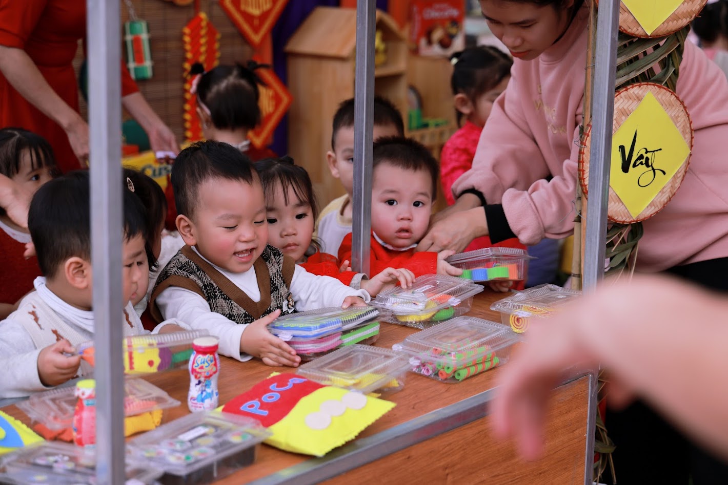 Mỗi độ Tết đến xuân về, trong lòng mỗi người lại rộn ràng những ký ức thân thương. Hôm nay, trong không khí ấm áp ấy, cô và các bé trường mầm non Ngọc Sơn cùng nhau tham gia chương trình Gói bánh chưng và Hội chợ Xuân, để các con được trải nghiệm hương vị Tết cổ truyền và cảm nhận niềm vui sum vầy. Lần đầu tiên được chạm tay vào lá dong xanh mướt, gạo nếp trắng ngần, đậu xanh thơm bùi…, các bé háo hức lắng nghe cô kể chuyện về chiếc bánh chưng – biểu tượng của lòng biết ơn và sum vầy. Những đôi bàn tay nhỏ xinh còn vụng về, nhưng ánh mắt thì lấp lánh niềm vui và sự tò mò. Chính từ những khoảnh khắc giản dị ấy, tình yêu văn hóa dân tộc đang được gieo mầm một cách tự nhiên và ấm áp. Không gian Hội chợ xuân rộn ràng tiếng cười với các gian hàng, trò chơi dân gian và sắc xuân ngập tràn đã mang đến cho các con một ngày trải nghiệm trọn vẹn. Các bé không chỉ được vui chơi, mà còn học cách chia sẻ, giao tiếp, hợp tác và cảm nhận ý nghĩa của Tết cổ truyền theo cách rất riêng của tuổi thơ.