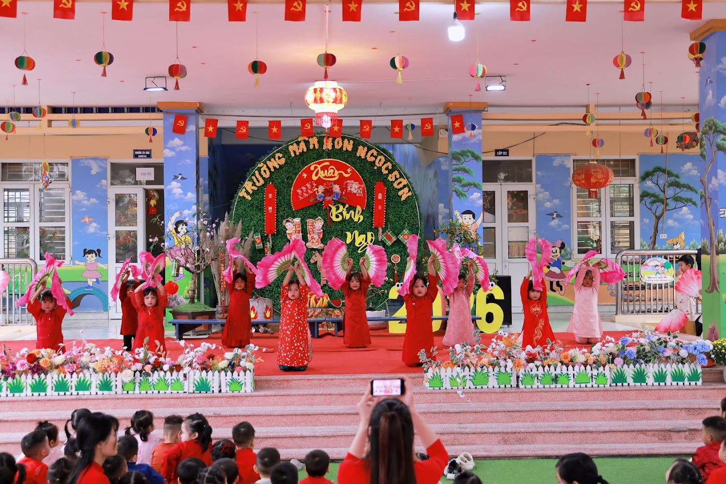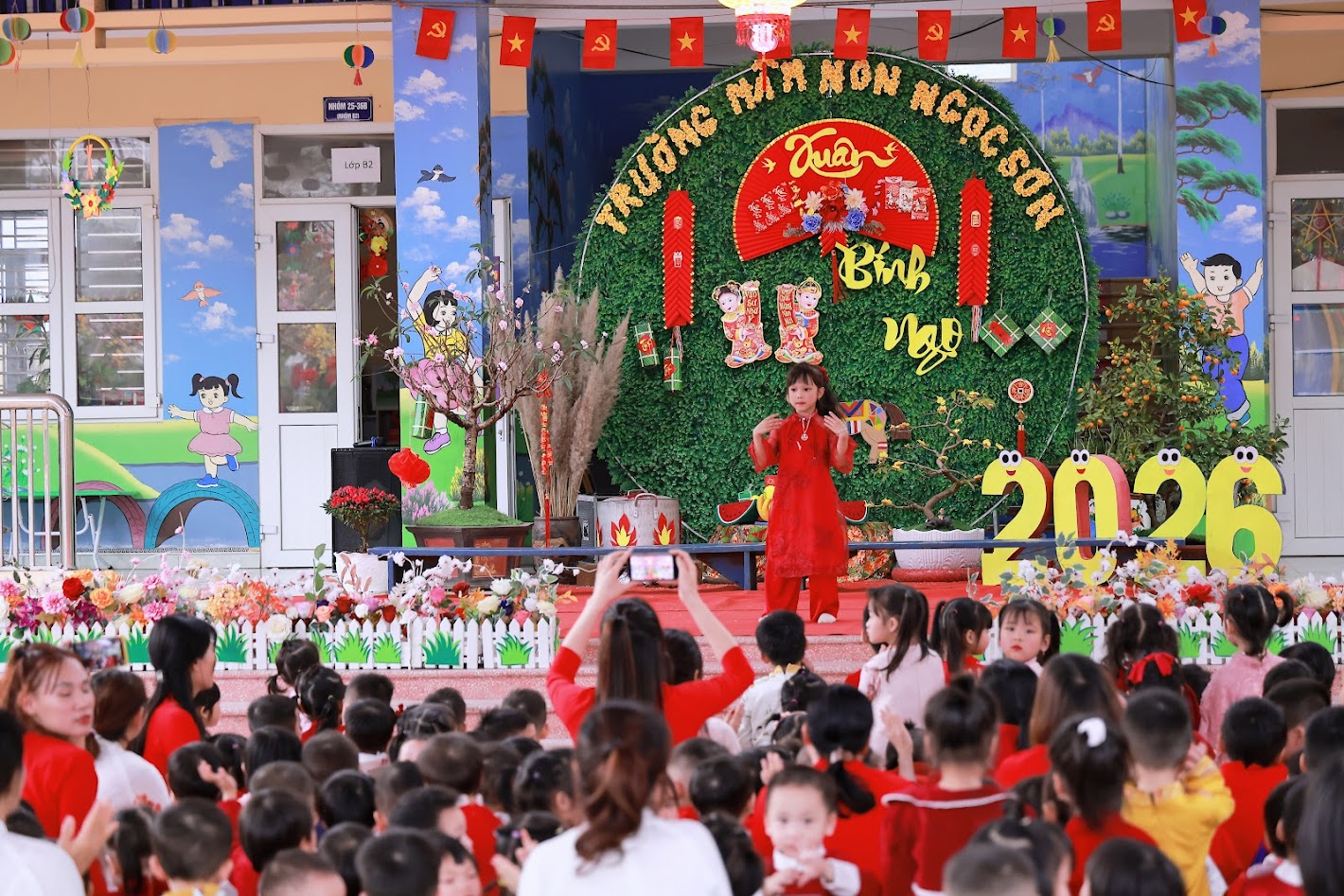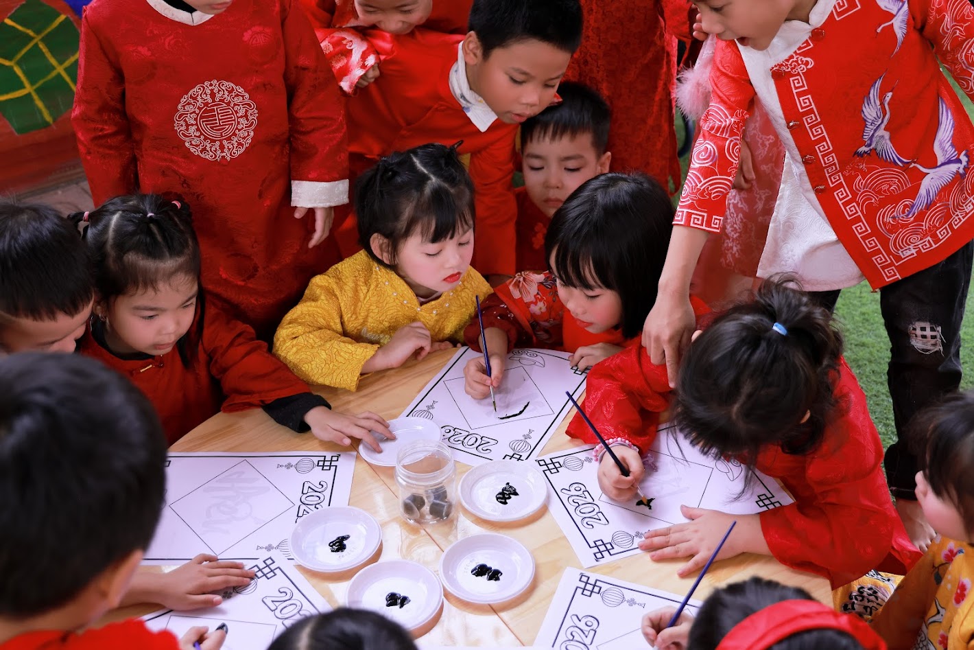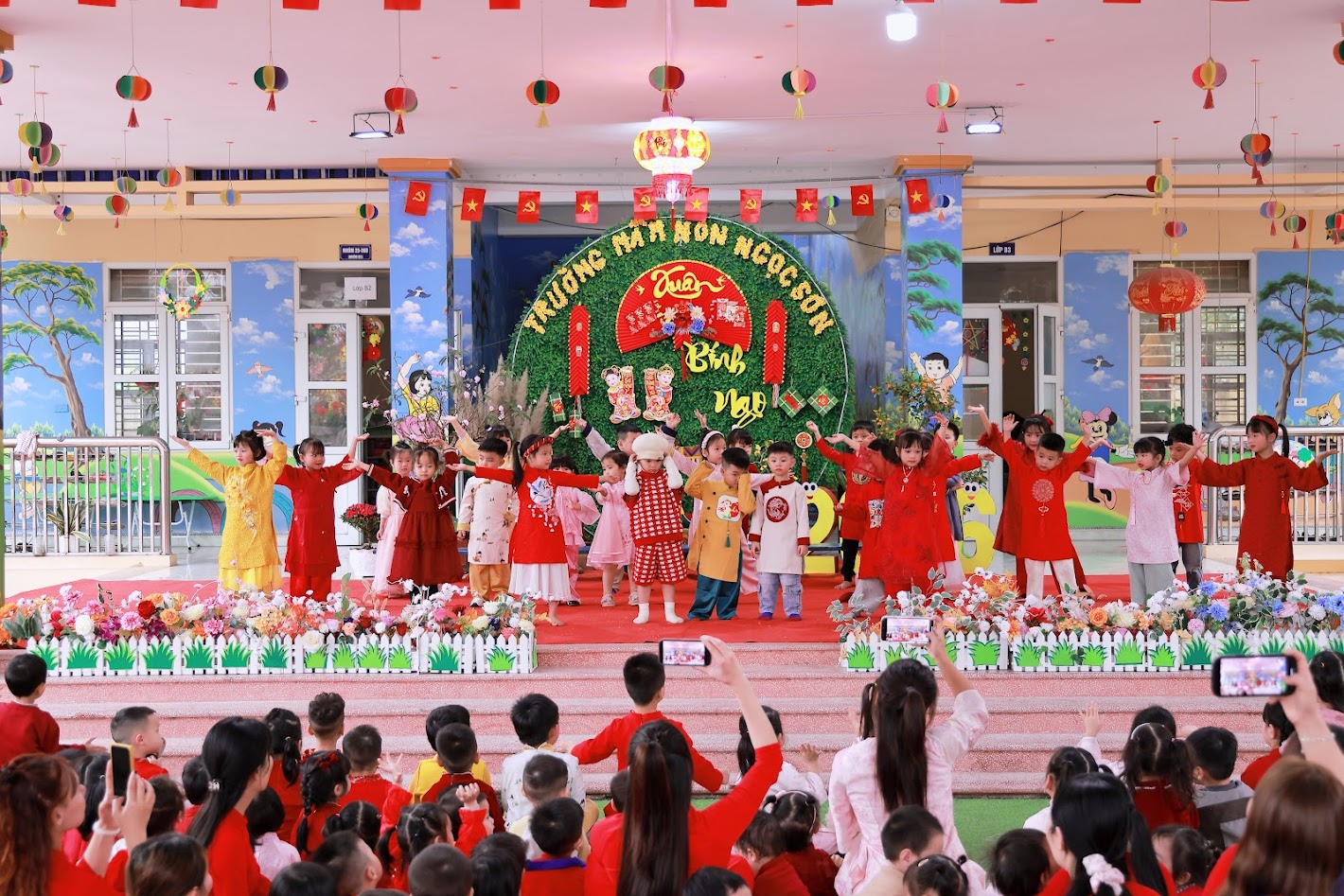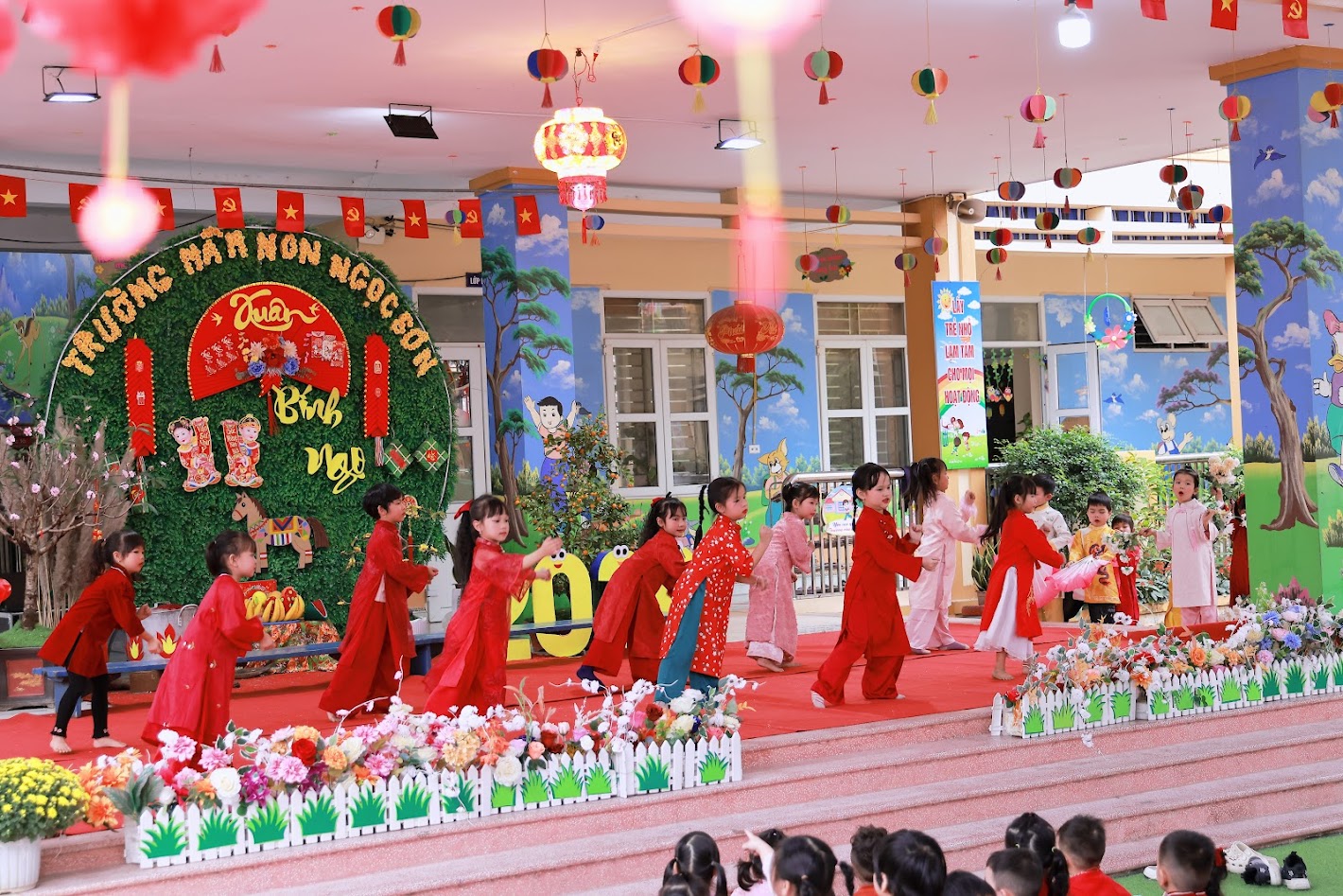Mỗi độ Tết đến xuân về, trong lòng mỗi người lại rộn ràng những ký ức thân thương. Hôm nay, trong không khí ấm áp ấy, cô và các bé trường mầm non Ngọc Sơn cùng nhau tham gia chương trình Gói bánh chưng và Hội chợ Xuân, để các con được trải nghiệm hương vị Tết cổ truyền và cảm nhận niềm vui sum vầy. Lần đầu tiên được chạm tay vào lá dong xanh mướt, gạo nếp trắng ngần, đậu xanh thơm bùi…, các bé háo hức lắng nghe cô kể chuyện về chiếc bánh chưng – biểu tượng của lòng biết ơn và sum vầy. Những đôi bàn tay nhỏ xinh còn vụng về, nhưng ánh mắt thì lấp lánh niềm vui và sự tò mò. Chính từ những khoảnh khắc giản dị ấy, tình yêu văn hóa dân tộc đang được gieo mầm một cách tự nhiên và ấm áp. Không gian Hội chợ xuân rộn ràng tiếng cười với các gian hàng, trò chơi dân gian và sắc xuân ngập tràn đã mang đến cho các con một ngày trải nghiệm trọn vẹn. Các bé không chỉ được vui chơi, mà còn học cách chia sẻ, giao tiếp, hợp tác và cảm nhận ý nghĩa của Tết cổ truyền theo cách rất riêng của tuổi thơ.