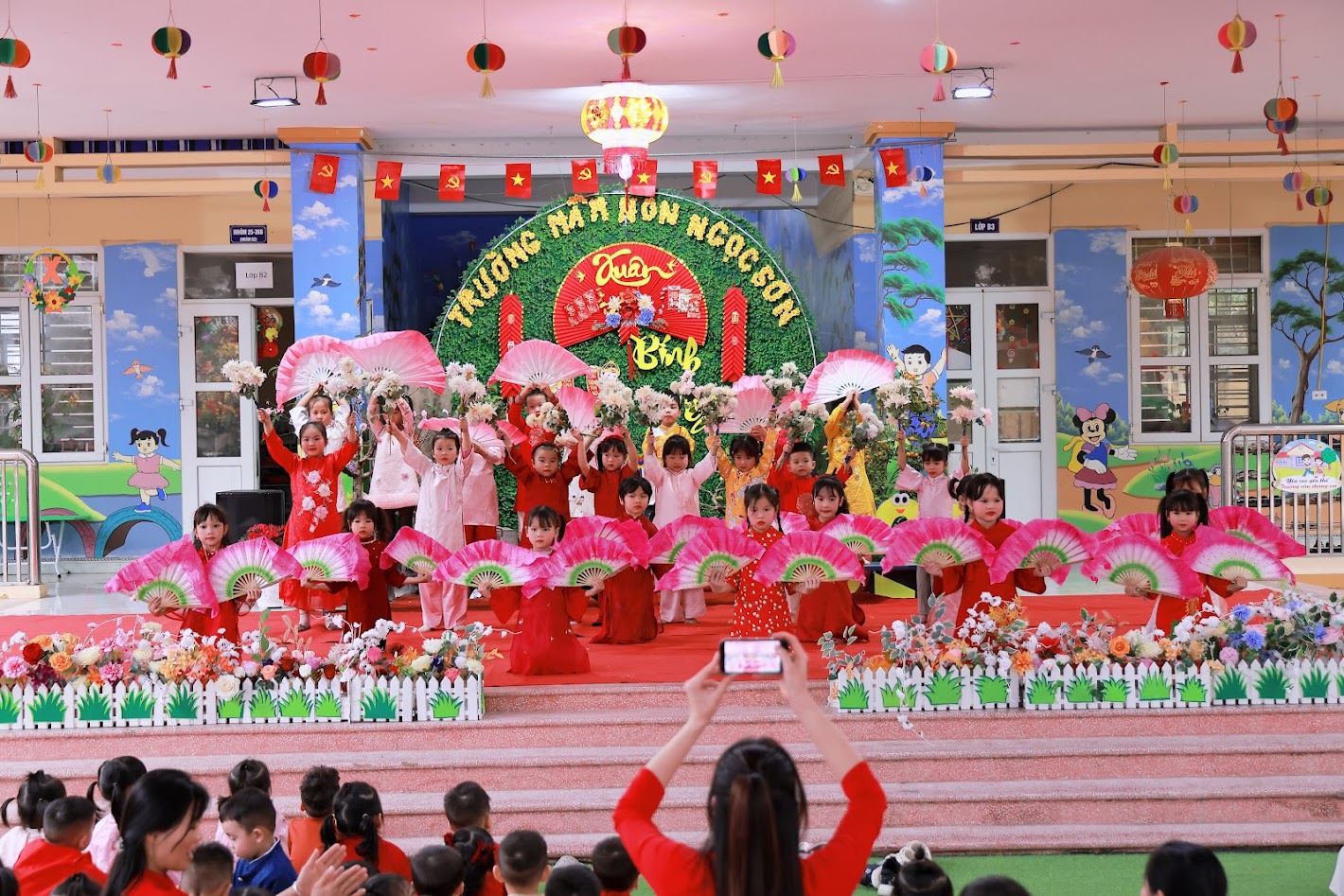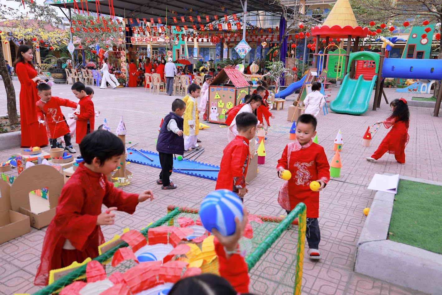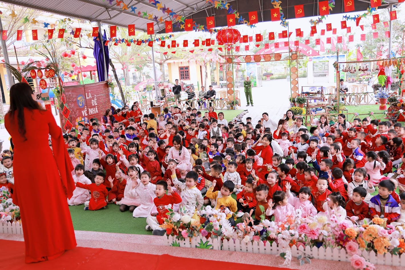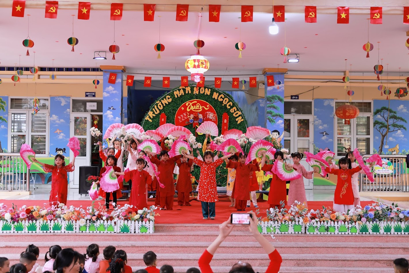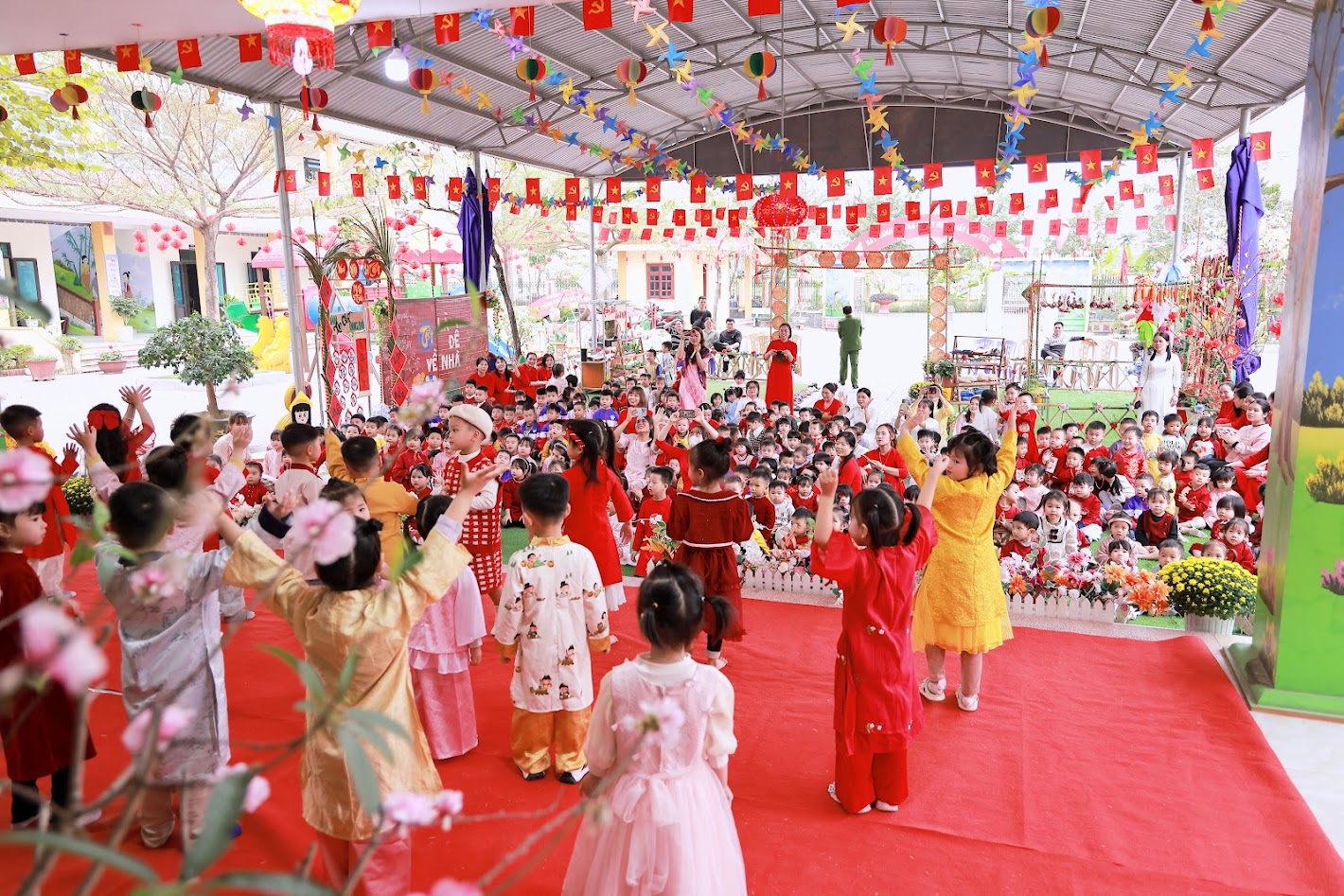 Mỗi độ Tết đến xuân về, trong lòng mỗi người lại rộn ràng những ký ức thân thương. Hôm nay, trong không khí ấm áp ấy, cô và các bé trường mầm non Ngọc Sơn cùng nhau tham gia chương trình Gói bánh chưng và Hội chợ Xuân, để các con được trải nghiệm hương vị Tết cổ truyền và cảm nhận niềm vui sum vầy. Lần đầu tiên được chạm tay vào lá dong xanh mướt, gạo nếp trắng ngần, đậu xanh thơm bùi…, các bé háo hức lắng nghe cô kể chuyện về chiếc bánh chưng – biểu tượng của lòng biết ơn và sum vầy. Những đôi bàn tay nhỏ xinh còn vụng về, nhưng ánh mắt thì lấp lánh niềm vui và sự tò mò. Chính từ những khoảnh khắc giản dị ấy, tình yêu văn hóa dân tộc đang được gieo mầm một cách tự nhiên và ấm áp. Không gian Hội chợ xuân rộn ràng tiếng cười với các gian hàng, trò chơi dân gian và sắc xuân ngập tràn đã mang đến cho các con một ngày trải nghiệm trọn vẹn. Các bé không chỉ được vui chơi, mà còn học cách chia sẻ, giao tiếp, hợp tác và cảm nhận ý nghĩa của Tết cổ truyền theo cách rất riêng của tuổi thơ.